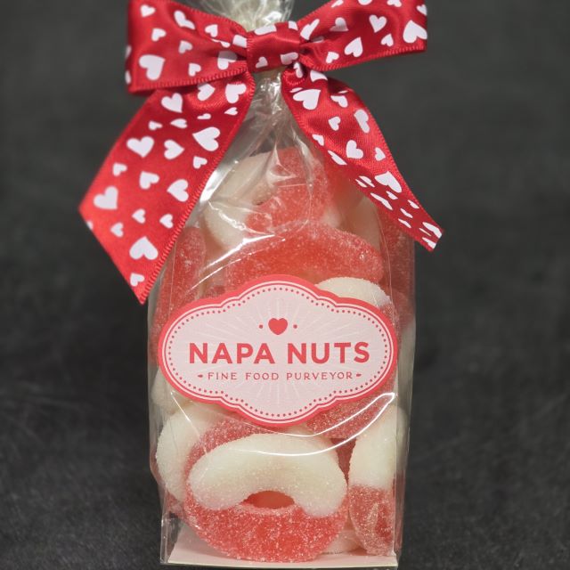 This is a 7 oz. bag of whimsical Gummi Watermelon Rings in a compostable cellophane bag. The bag is adorned with a special Napa Nuts Valentine's Day-themed pink label with a cute little heart, finished with an adorable heart ribbon.
